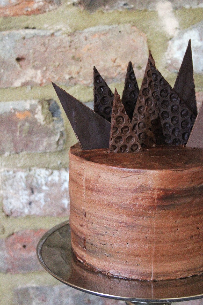 - Now you are ready to assemble the cake. Level off the tops of the sponges with a cake cutter or large bread knife to make sure you have even layers. Take your first sponge and spread over a layer of ganache followed by a layer of buttercream. Top with the next sponge and repeat until you have a stack of three. Cover the whole cake in buttercream and smooth the sides with a palette knife or cake scraper. Decorate with the shards or any other decorations you fancy.