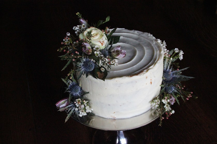 8. With the remaining cream cheese frosting, cover the cake all over and smooth down with a cake scraper. Decorate with fresh flowers dusted in frosty edible glitter or get creative and come up with your own design to suit the occasion.