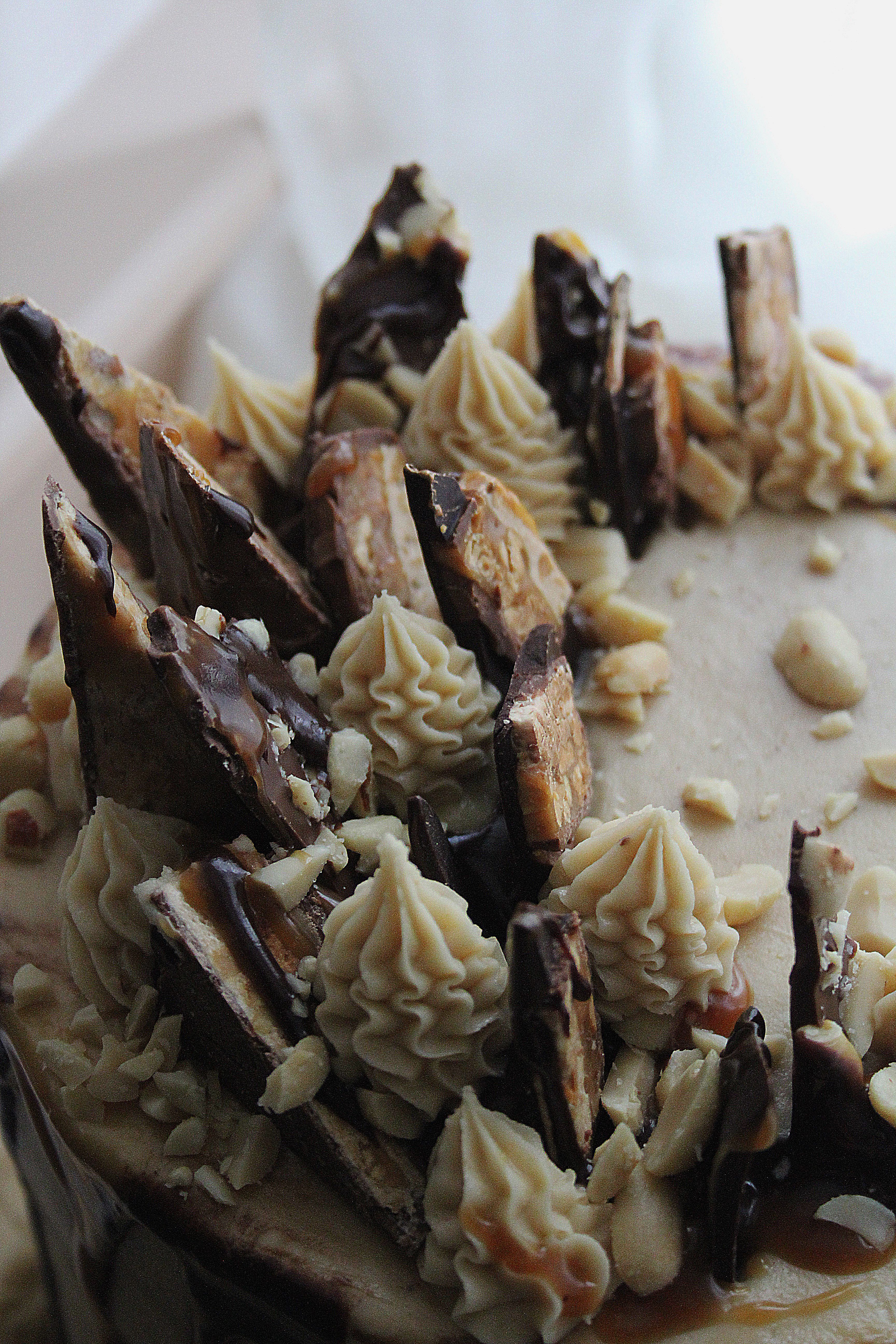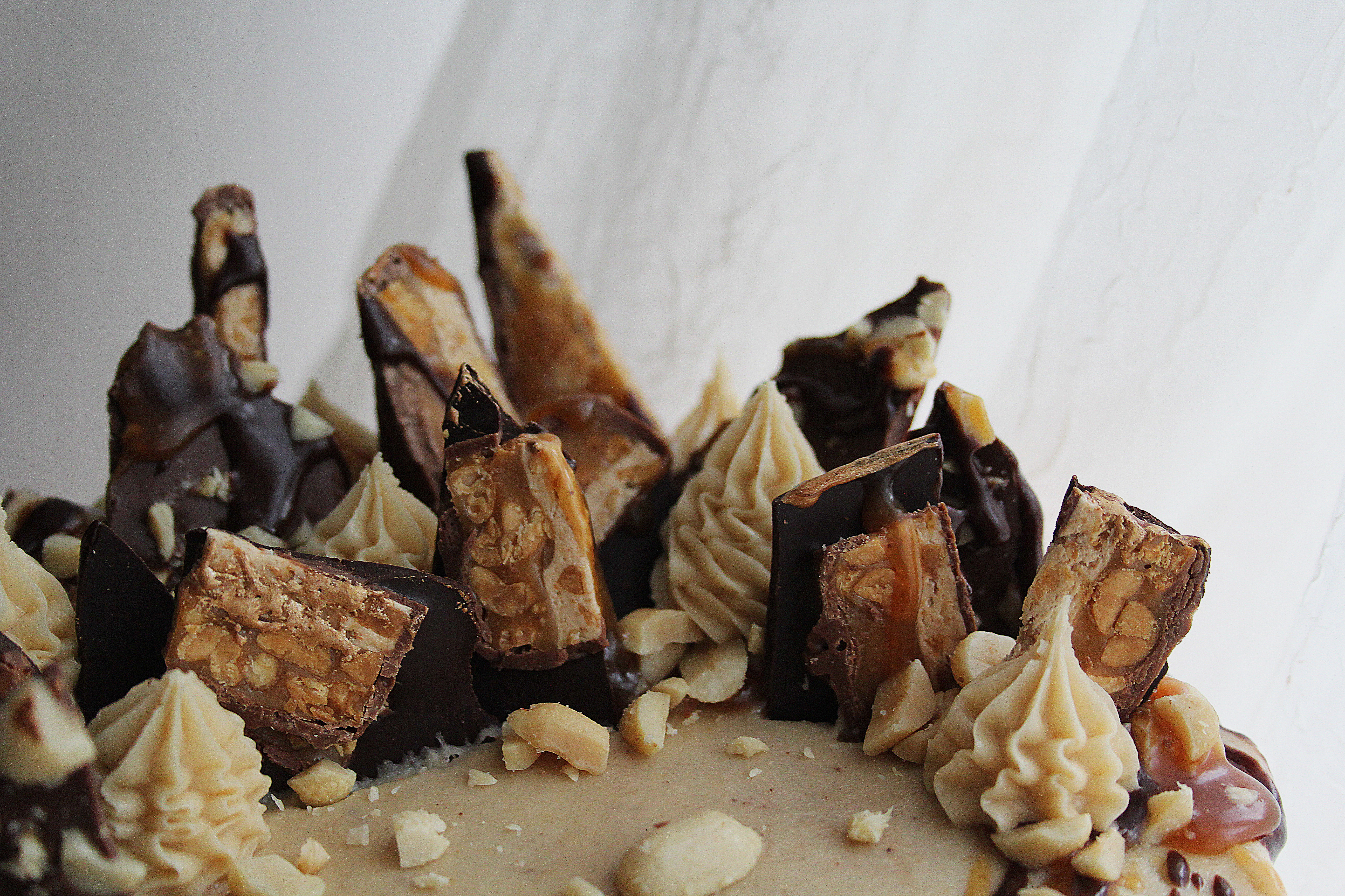 - To assemble the cakes stack a chocolate layer with ganache and salted caramel, followed by a brown sugar layer. Repeat this process then cover the entire cake with peanut butter icing. You can be as neat as you like! Decorate with peanuts, Snickers pieces and chocolate shards (more is more in this case!).