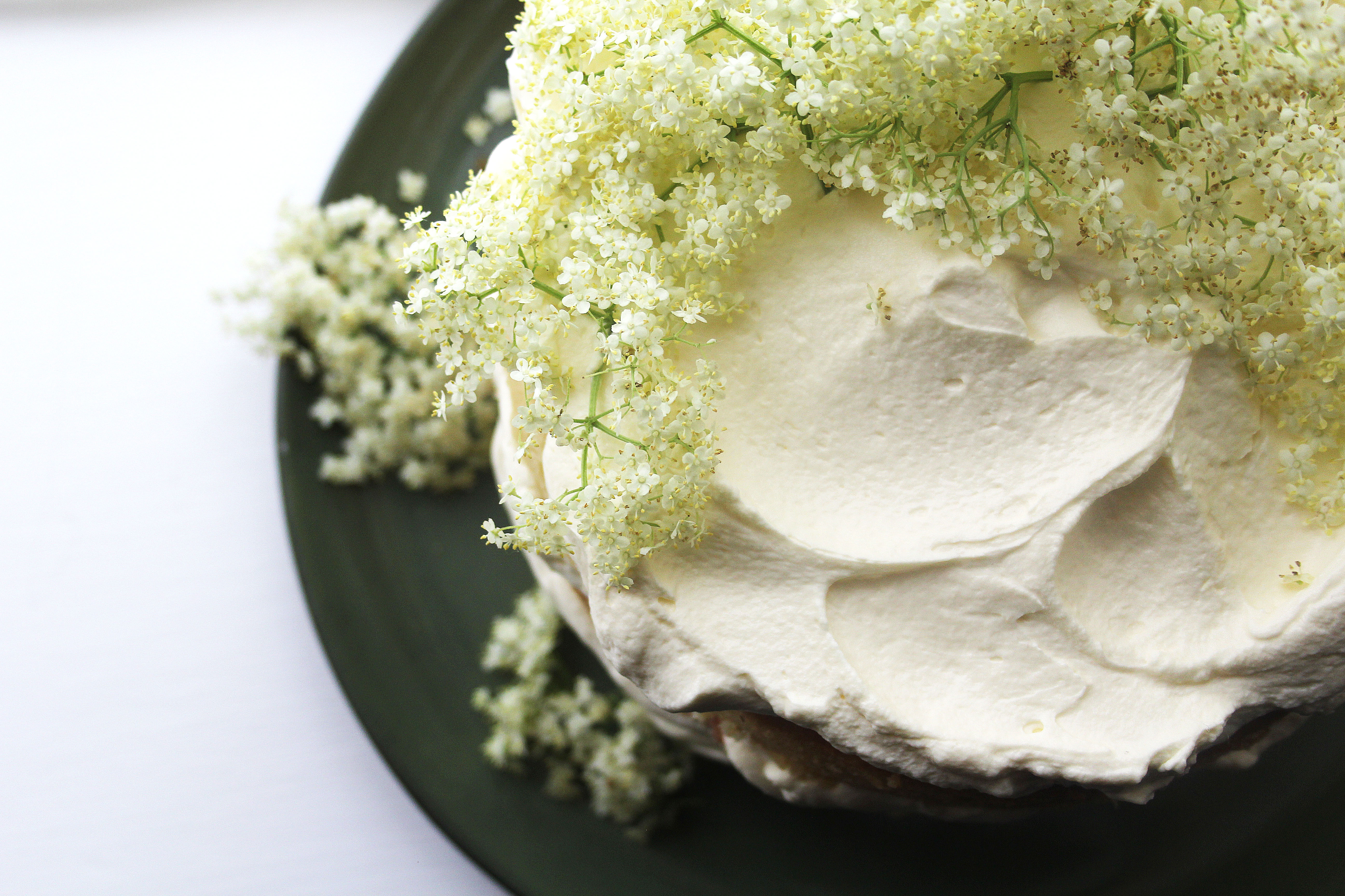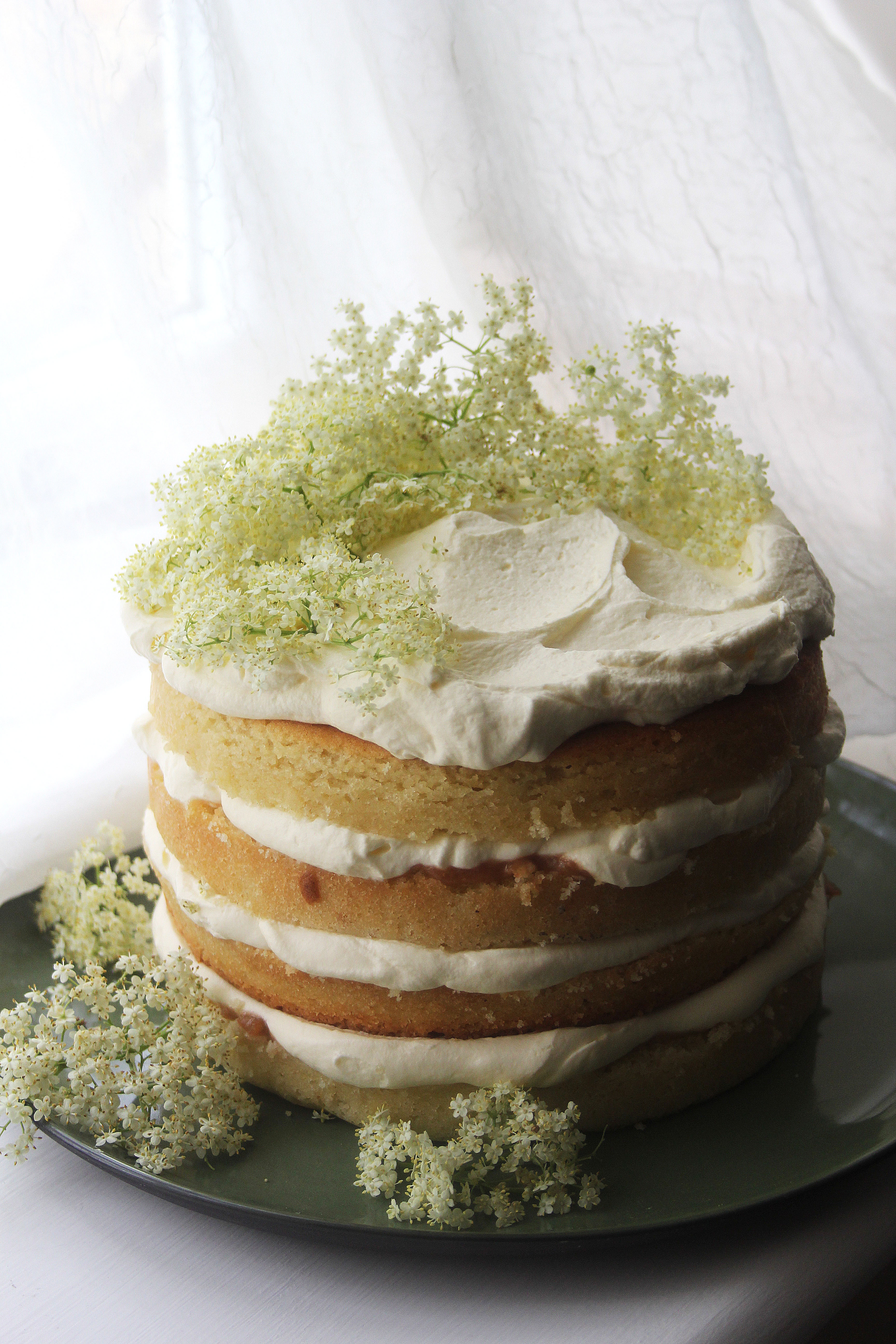 - Once all your elements are cool, assemble the cake. Spread a generous layer of compote and several dollops of elderflower cream between each sponge, then finish with a few sprigs of elderflower for a simple, effortless summer pudding.