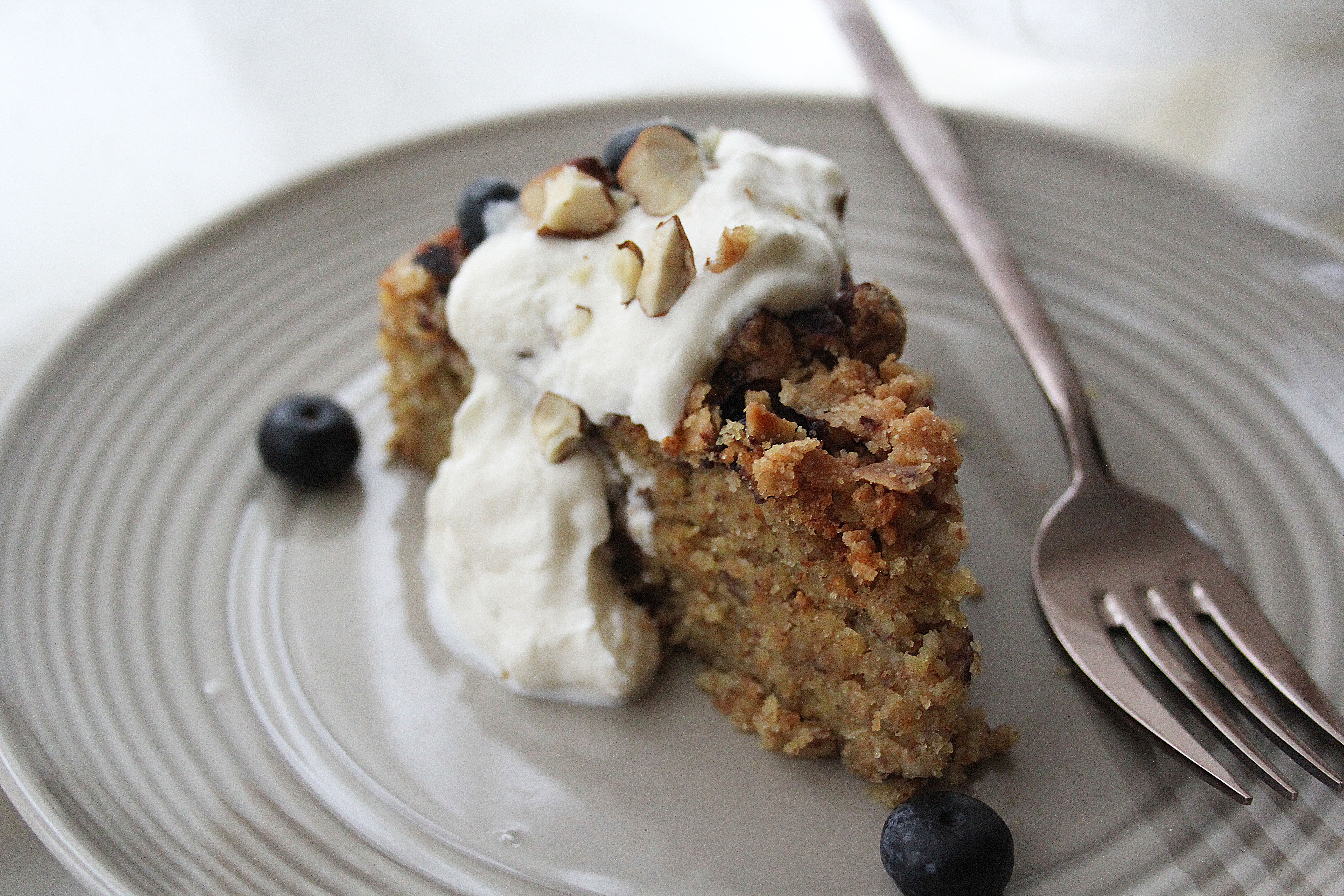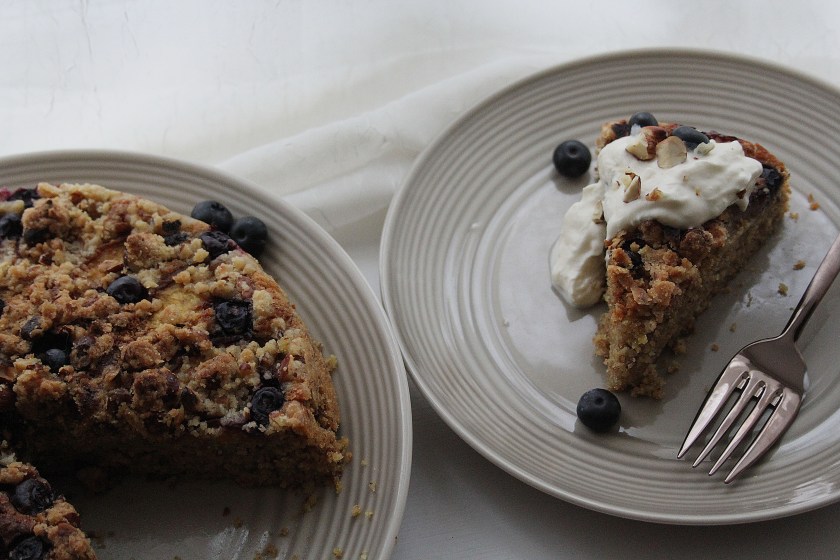 - Once the eggs and peaches have been incorporated into the butter and sugar, fold in the remaining flour, blitzed hazelnuts, baking powder and salt. Scrape the mix into the prepared cake tin and level out. Arrange the peach slices on top in a pattern then sprinkle over the blueberries and hazelnut crumble.