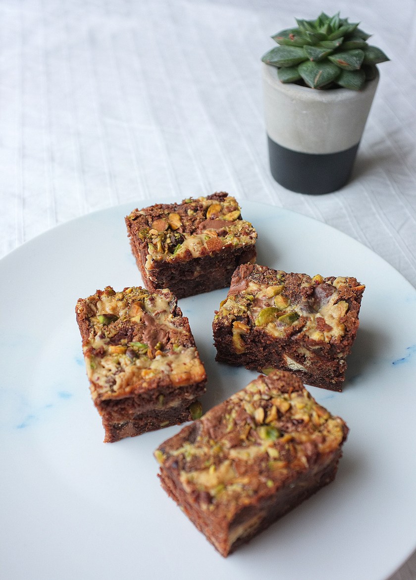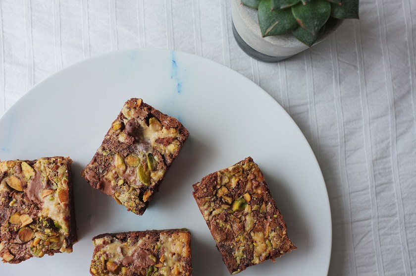 First off, apologies for the brief recipe hiatus. I’ve recently moved house and have been trying to figure out the perfect temperature to bake with in my new (incredibly retro) gas oven. And no, it’s not been as simple as converting degrees to gas marks- this oven has its own special way of working (i.e. it’s lukewarm for the majority of settings until the last when it turns into Mordor and burns everything in sight). Anyway I think I’ve cracked it now, so here’s my first recipe a la 1980s oven; tahini and pistachio brownies. They’re really simple to make but deliver everything you’d expect from a really good brownie- a dense, moist texture with added crunch from the pistachios and a deep indulgent chocolate flavour, which is definitely enhanced by the slightly salty, nutty pockets of tahini and halva.