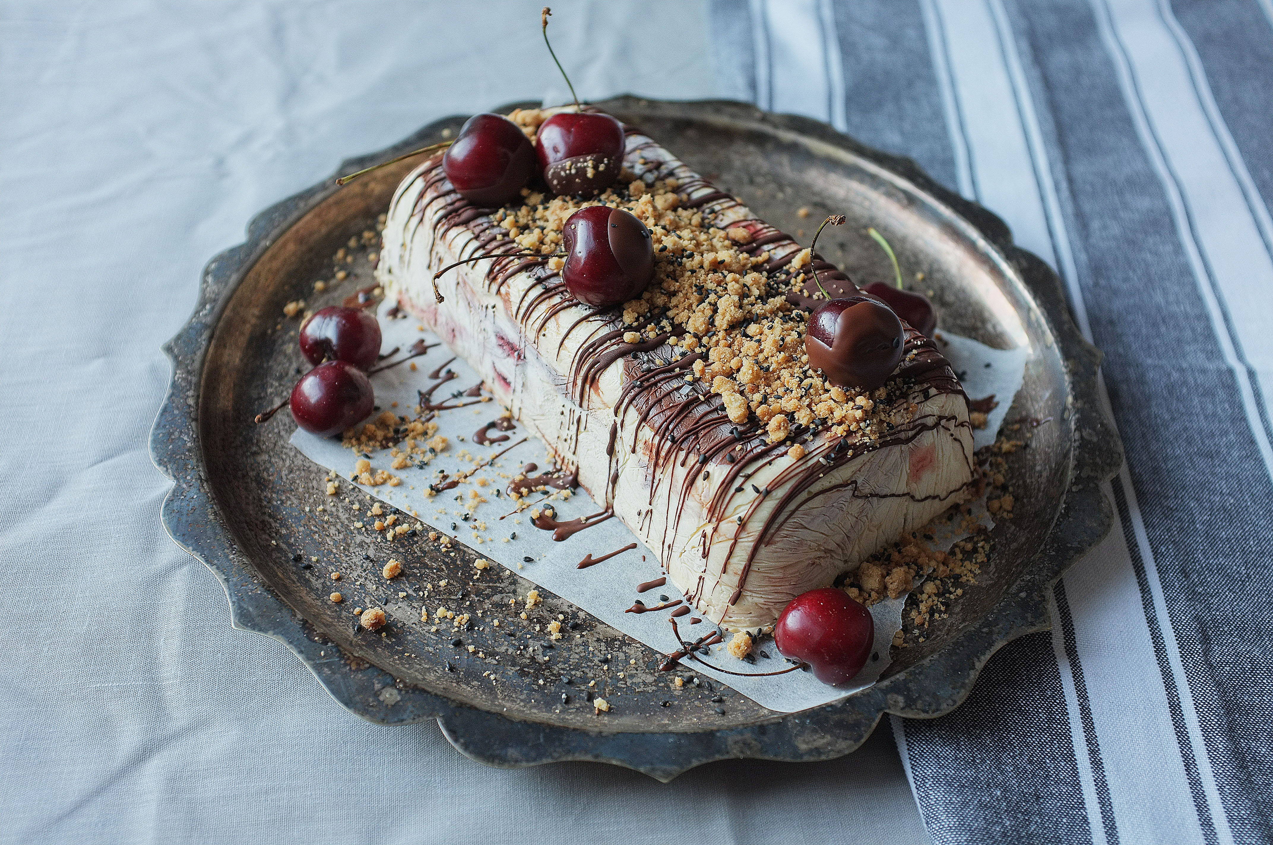 - Spoon the remaining chocolate ganache and cherry compote into the bottom of the prepared tin, then spoon in the parfait mix. Cover with cling film and freeze for at least 4 hours.