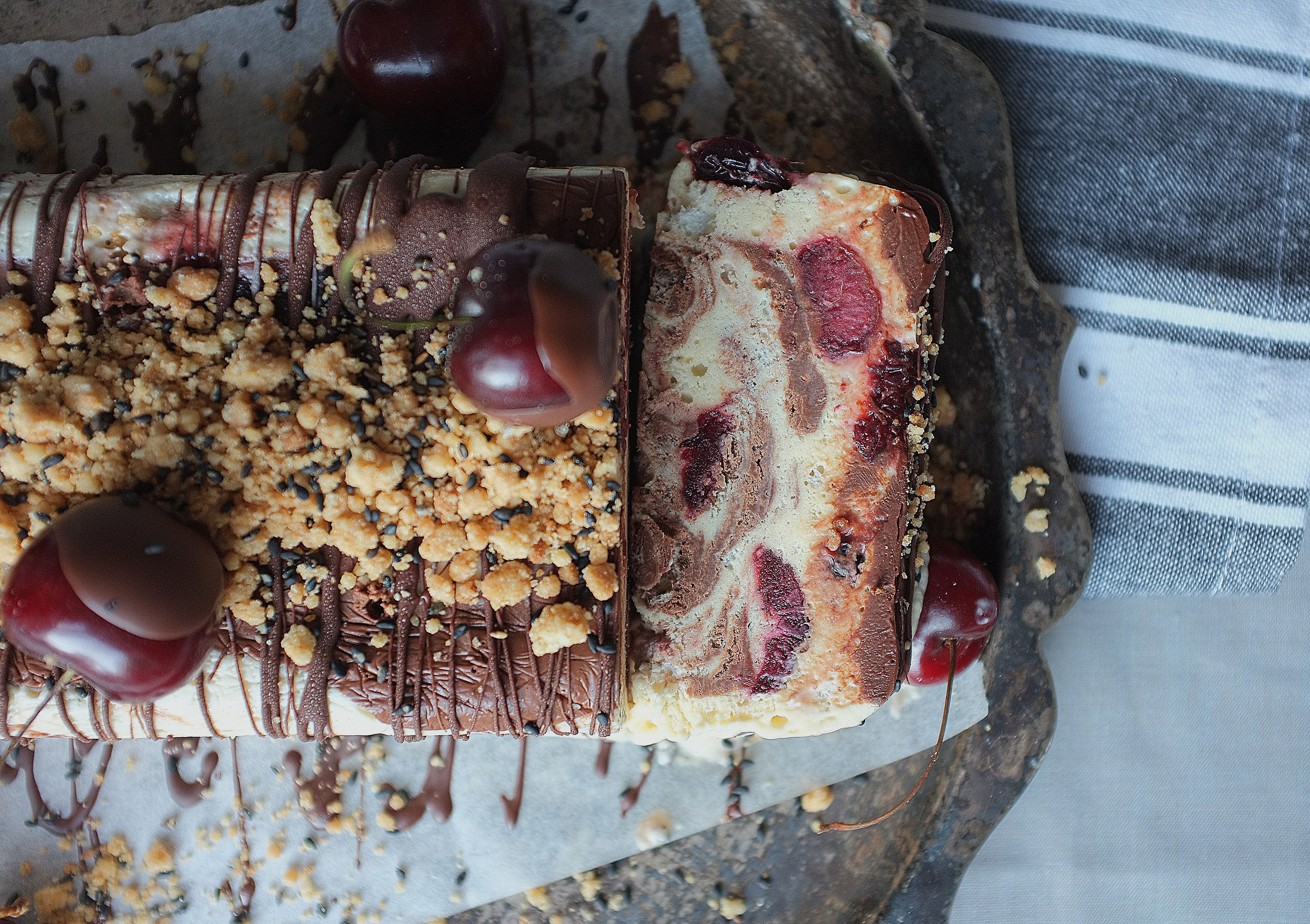 - Take the parfait out of the oven 10 minutes before you’d like to serve it to allow it to soften slightly. Sprinkle on the sesame crumble and finish with some fresh cherries.