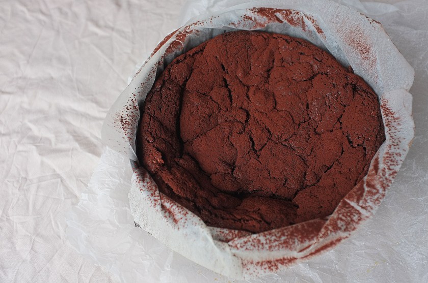 - Bake for 50-60 minutes, then leave to cool completely in the tin. When cooling, the top of the cake will dip and crack- don’t worry, it’s a smooth, flourless torte, not a sponge cake! Once cool, slice up and finish with a dusting of cocoa powder. Serve with creme fraiche, if you like.