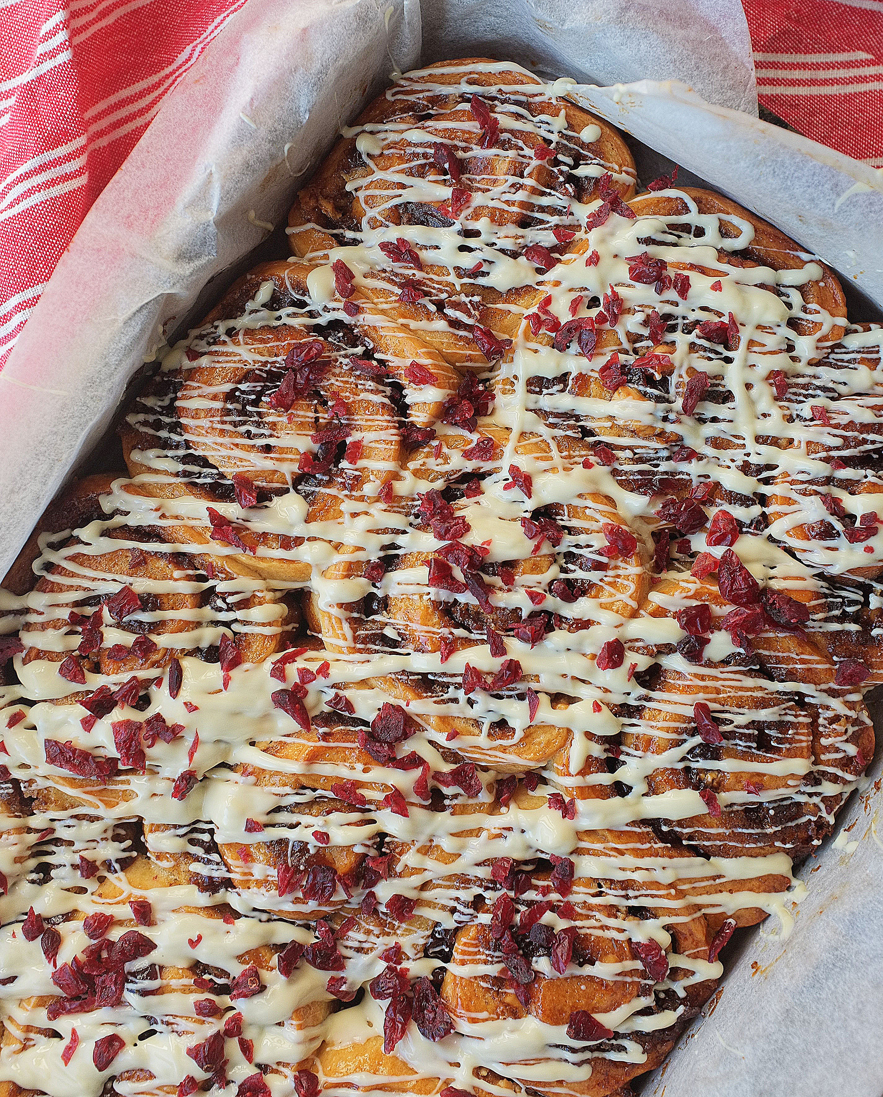 - Once the dough has proved, tip out onto a lightly floured surface and roll into a rectangle, about 5mm thick. Spread the cinnamon butter mixture across the surface of the rectangle in an even layer, ensuring that you go all the way to the edges. Now strain the orange juice away from the dried fruits into a saucepan (save this for later). Sprinkle the fruits over the cinnamon butter then lastly distribute the chopped white chocolate.