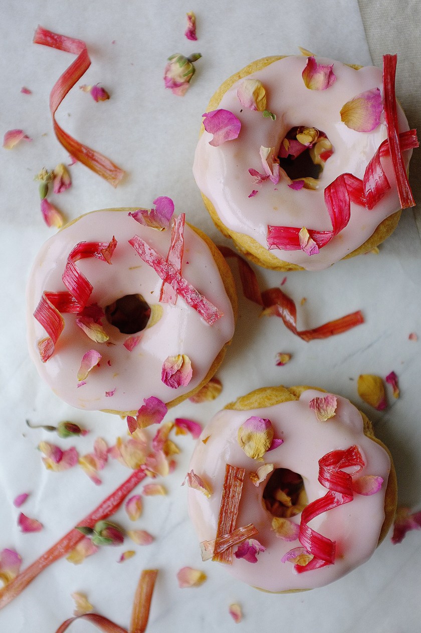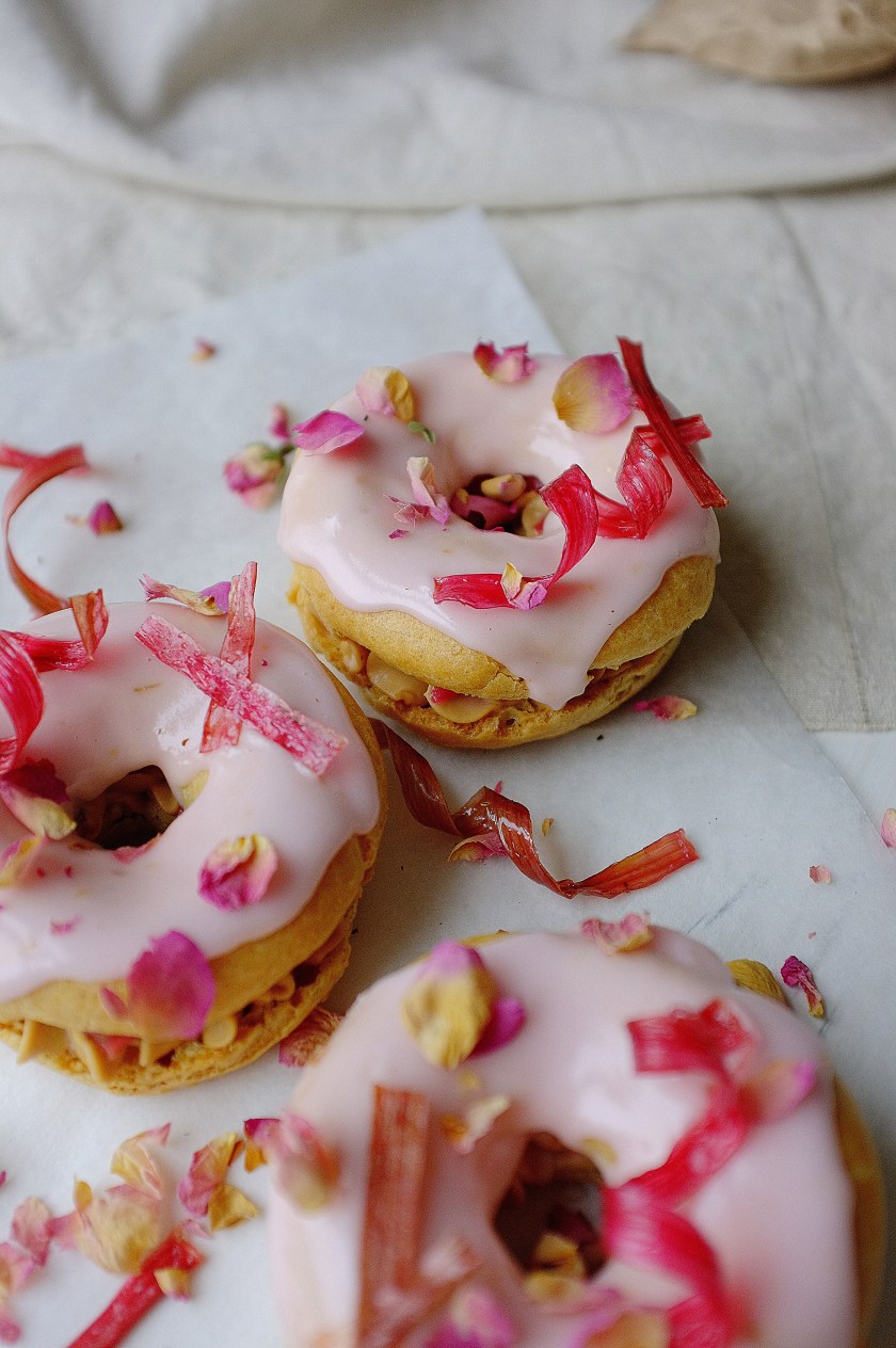 - For the pink icing, pour the cooking syrup from the rhubarb tray into the icing sugar and mix to create a smooth drizzle-like consistency (add in a little water if you don’t have enough syrup). Spoon this over the filled choux-nuts and garnish with edible petals and rhubarb ribbons.
