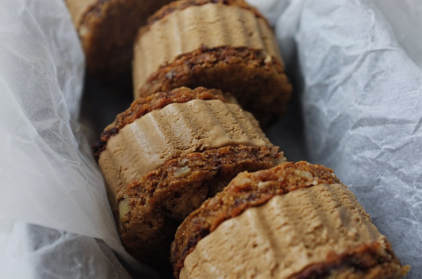 These cookie sandwiches are a culmination of my three favourite things; coffee, chocolate and ice cream. The pecans add crunch, and the bitter note of espresso prevents the result from being overly sweet. There’s not a lot else to say- other than go forth and make them (but proceed with caution, they’re like crack).
