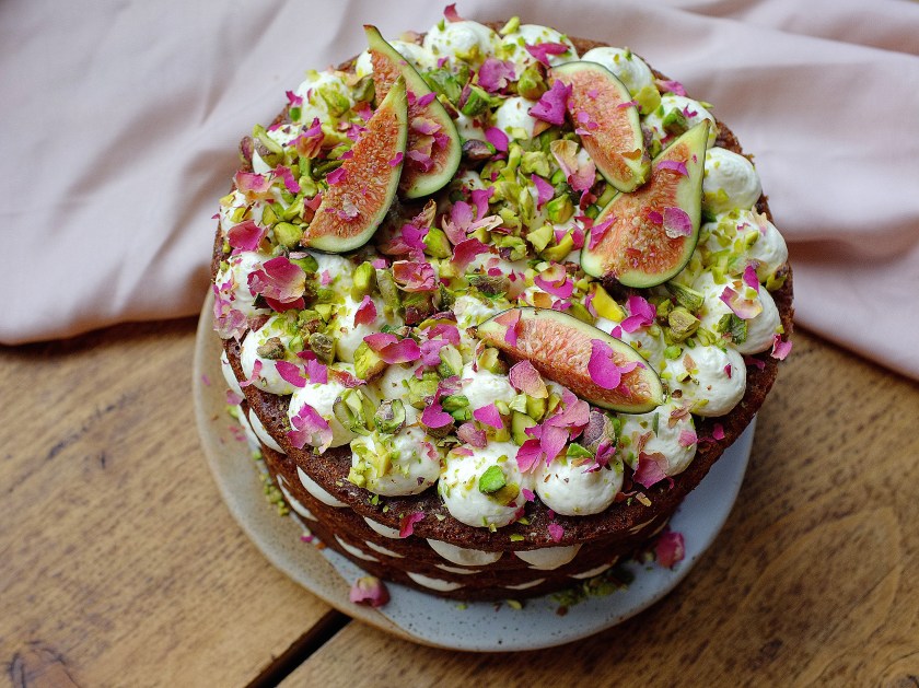 - Once the cakes have cooled down, slice them in half horizontally, leaving you with 4 equal layers. Pile the rose and honey cream into a piping bag with round nozzle. Place the first layer onto a serving plate and pipe little mounds all over the surface, then top with the next layer. Repeat until all the cream mixture is used up, then sprinkle rose petals and pistachios over the top and arrange the figs in an attractive way, if using.