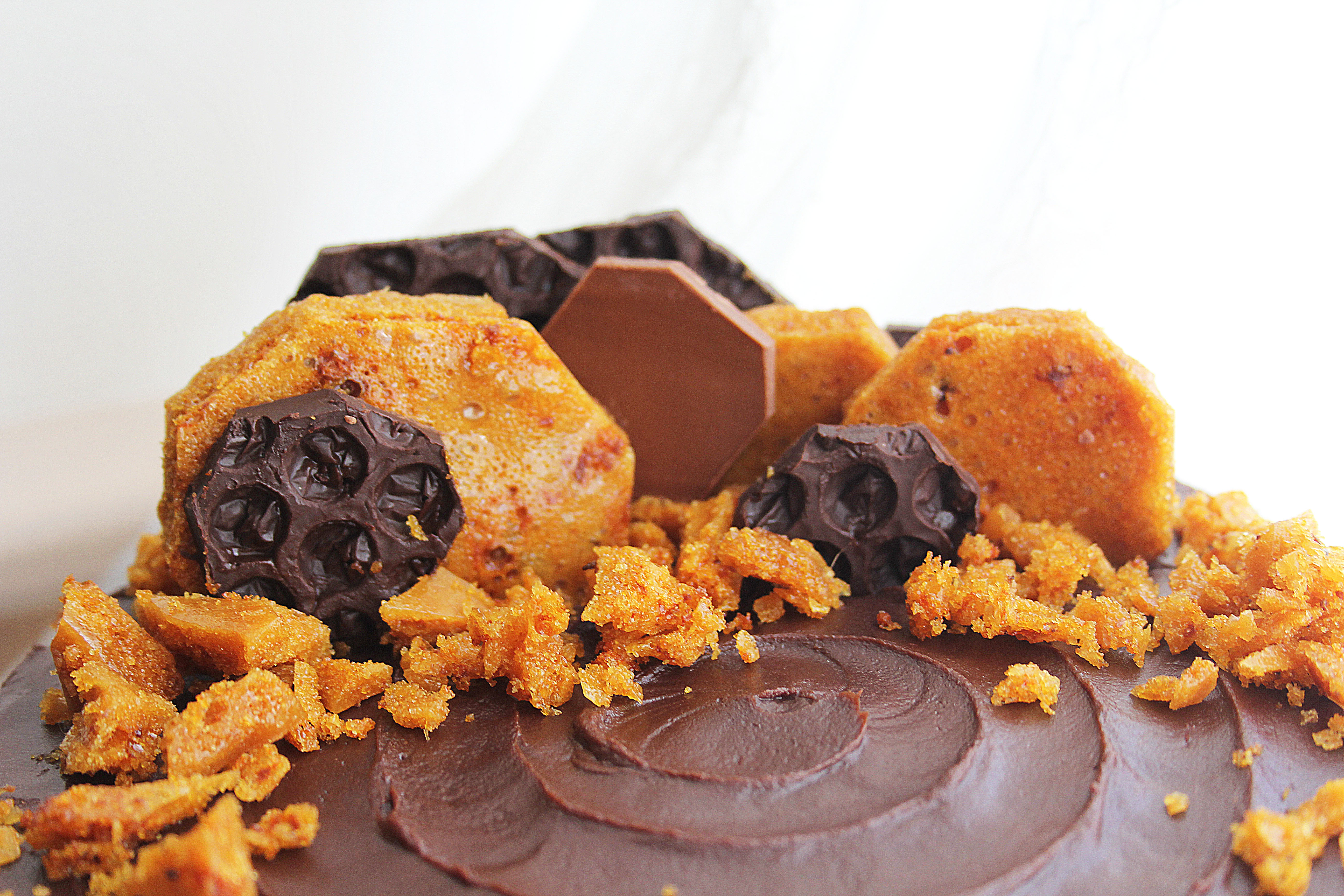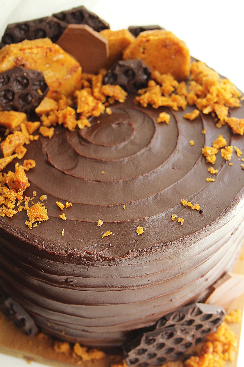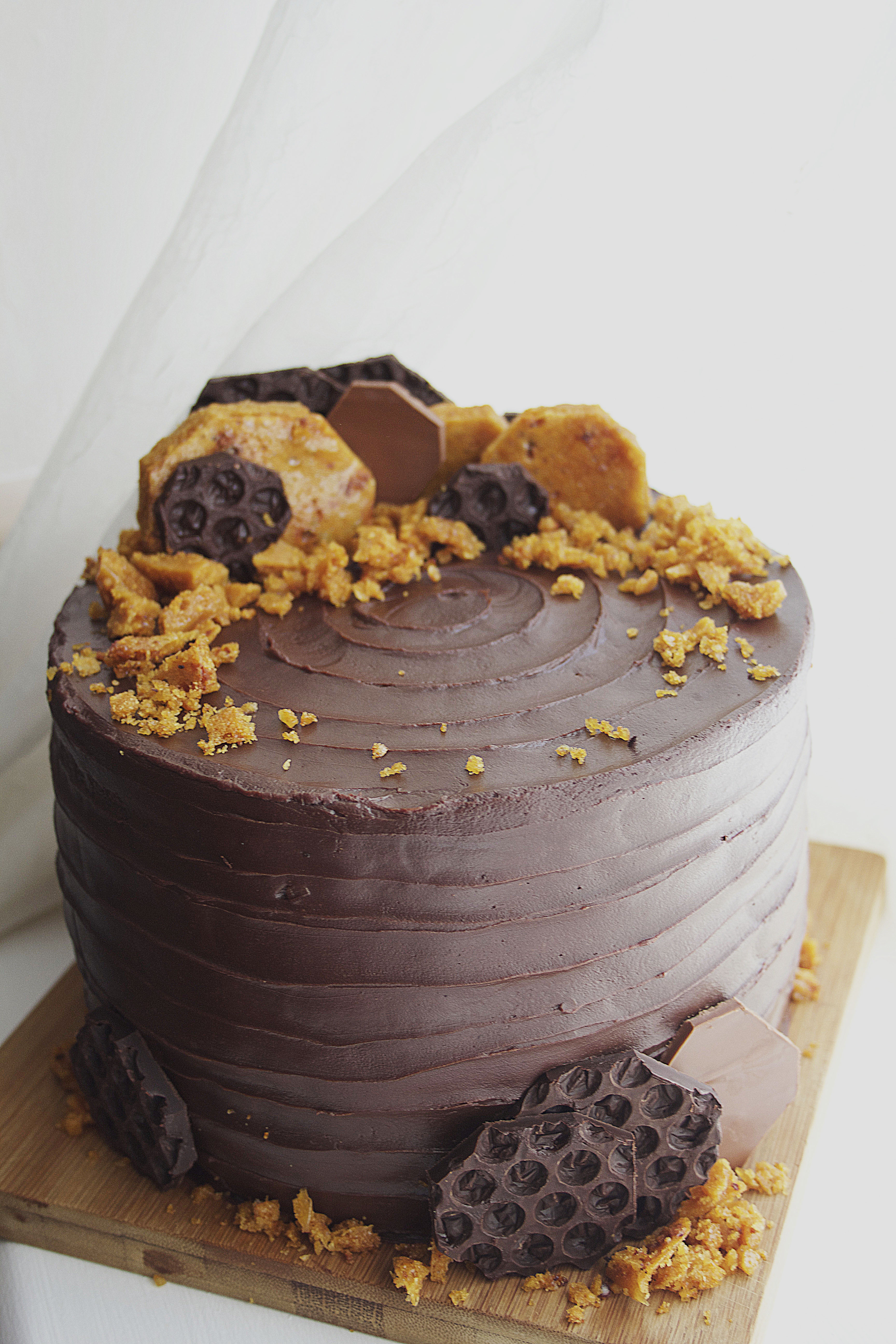 - After chilling the cake spread the ganache all over its surface. I used a palette knife to create a line pattern on my cake to tie in with the honeycomb theme but you could make it super sleek and smooth or go for a really rustic look- it’s up to you. To finish it off break up the honeycomb and use as decorations; I also made some toppers by setting melted chocolate over bubble wrap, but it really isn’t necessary!