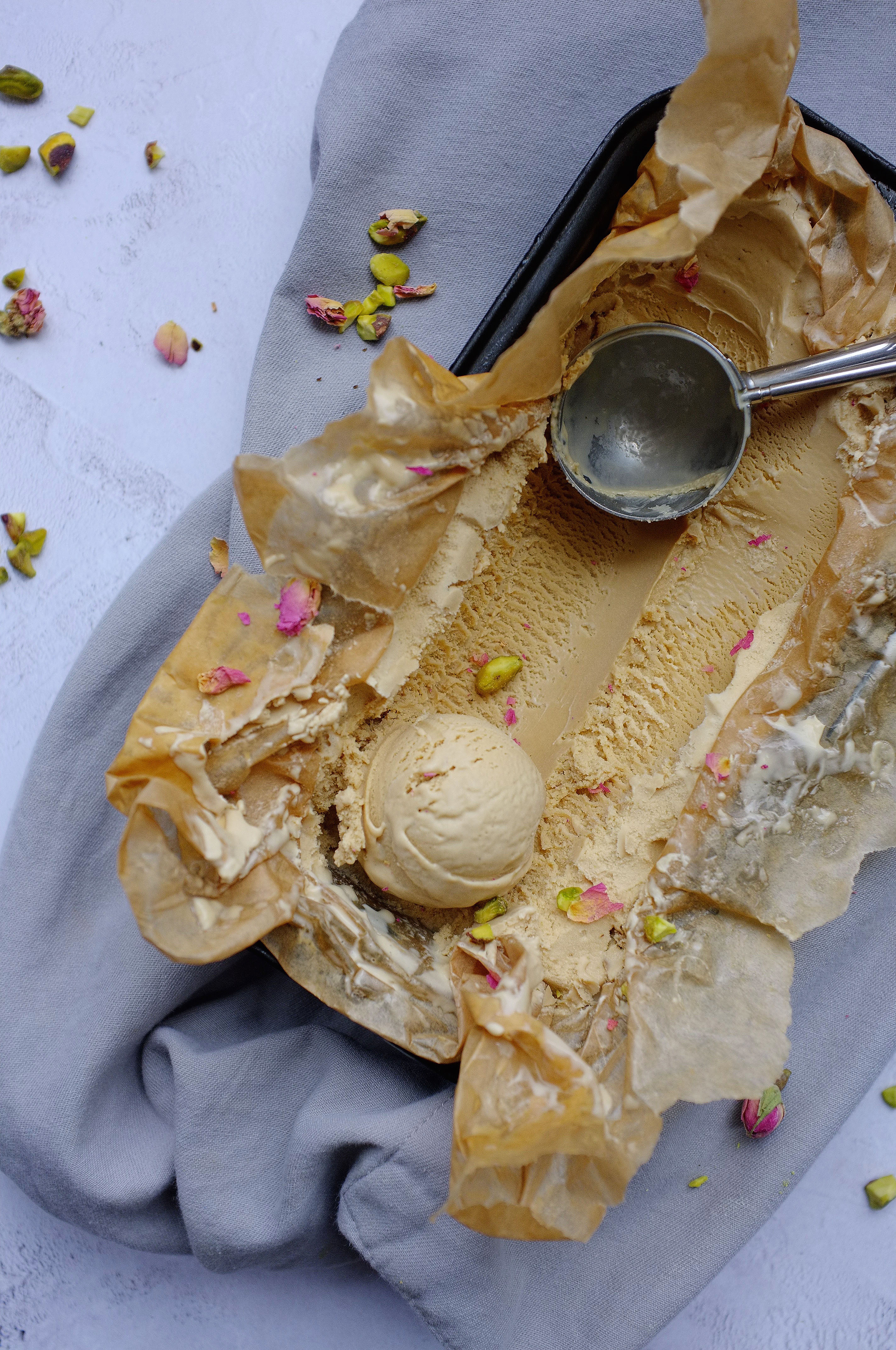 - Meanwhile, make the honeycomb. To do this line a medium high sided baking tray with baking paper then place the sugar, syrup, salt and ground cardamom in a small saucepan. Heat until the sugar has dissolved and you have a golden, slightly simmering liquid, then add the bicarbonate of soda, remove from the heat and mix (just a few seconds, until the bicarbonate of soda has disappeared.). It will rise up quickly and go foamy. Tip into the prepared tin and leave to set hard.